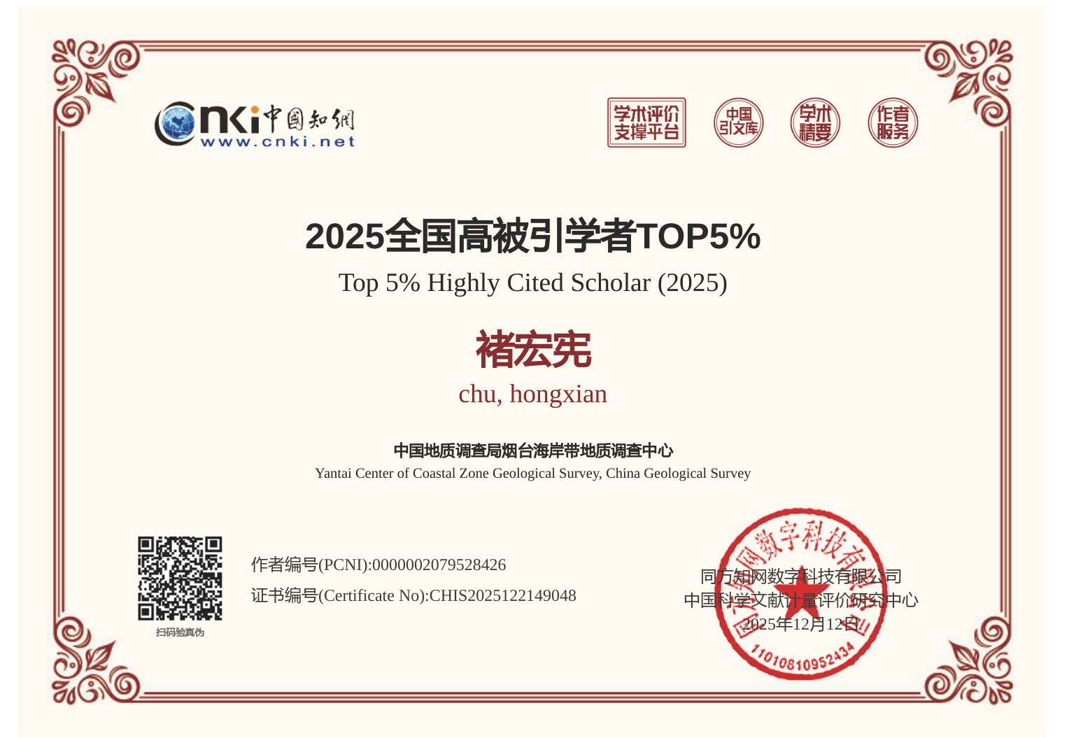 近日,中国知网正式发布“2025全国高被引学者”榜单。中国地质调查局烟台海岸带地质调查中心(以下简称“烟台中心”)正高级工程师褚宏宪凭借深厚的学术积淀,再度入选环境科学与工程学科“2025全国高被引学者TOP5%”行列。