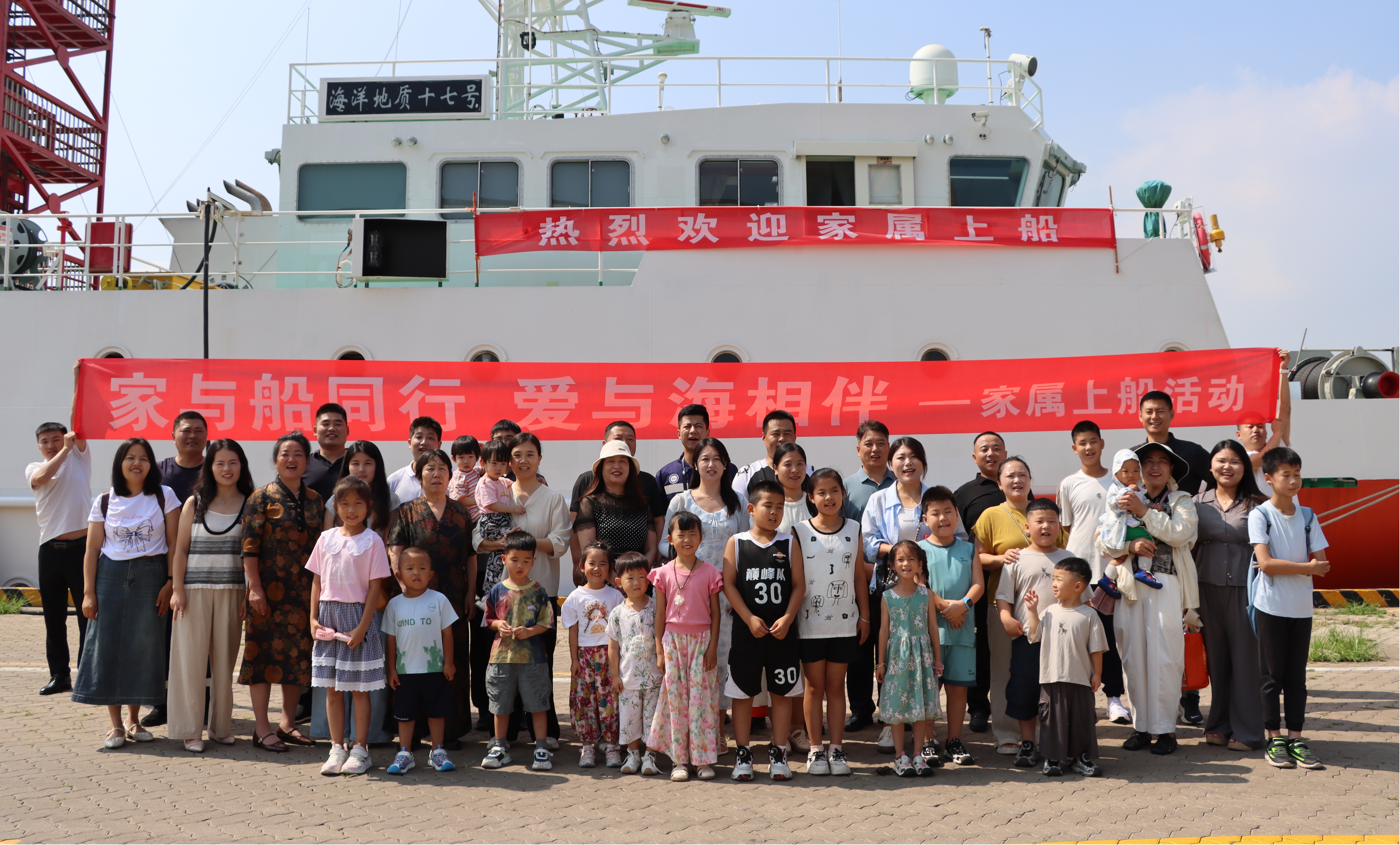 近日,中国地质调查局烟台海岸带地质调查中心(以下简称“烟台中心”)“海洋地质十七号”调查船迎来了特殊访客,船员们携手妻儿登船,自豪地为亲人讲起自己工作的故事。