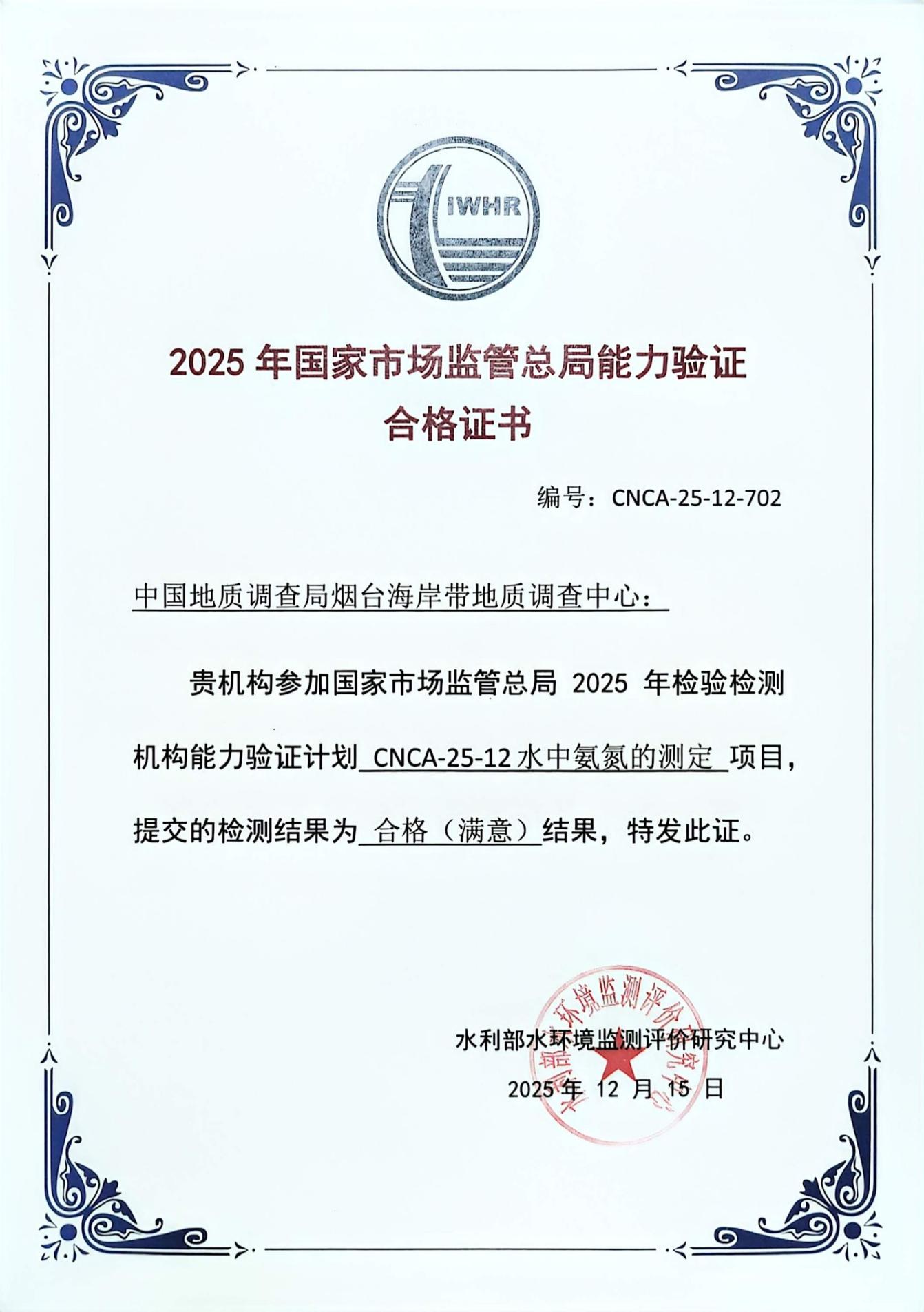 近日,中国地质调查局烟台海岸带地质调查中心(以下简称“烟台中心”)顺利通过2025年“水中氨氮的测定”能力验证,并取得合格证书。