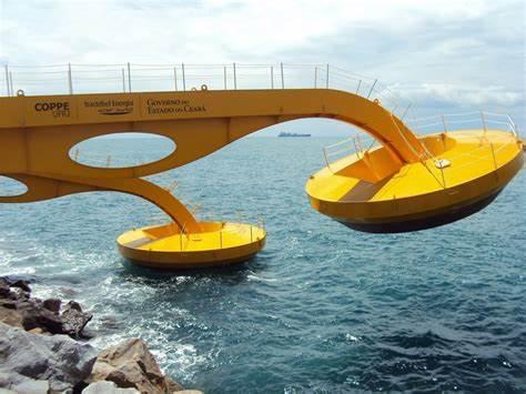 动力资源。主要指海水运动过程中产生的潮汐能、波浪能、海流能以及海水因温差和盐度差而引起的温差能与盐差能。海洋能具有储量大、无污染、廉价和可再生等优点,越来越受到人们的重视。潮汐能储量丰富、再生不竭,集中在沿海的港湾和河口地区,便于开发利用。潮汐能主要用来发电,据估计潮汐每年可能的发电量就比人类有史以来已消耗的能量总和还要大 100倍。波浪发电是指利用海面波浪的垂直运动、水平运动和海浪中水的压力变化产生的能量来发电。波涛汹涌的大海蕴藏着巨大的波浪能,据估计每平方千米的海面上,波浪的最大功率可达10万-20万千瓦(图5)。目前,海流发电处于小型试验阶段,由于大多数地区的海流流速较低,且不稳定,加之技术还有不少问题有待解决,因此海流发电开发较慢。